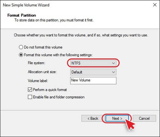 e. Select ‘Format this volume with the following settings’, choose NTFS as a file system, and click Next.