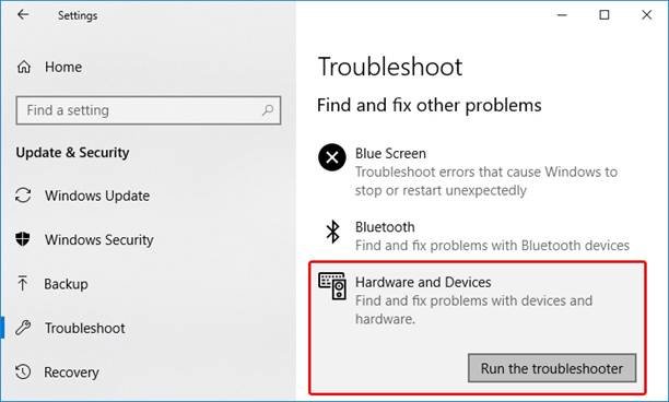 b. Open Update & Security, follow Troubleshoot > Hardware and Devices.
