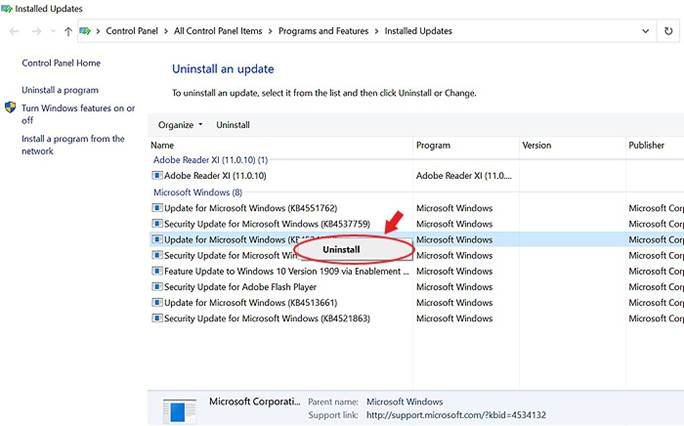 c. Right-click on the update, click Uninstall > Yes.